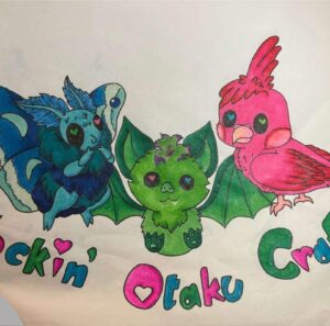 A freelance artist specializing in digital art and crafts featuring vibrant colors, fantasy creatures, dinosaurs, anime fanart, and collectible accessories