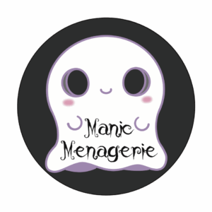 A spooky/cute artist creating stickers, keychains, prints, coasters, clay figurines, and various art goods with distinctive dark yet adorable themes